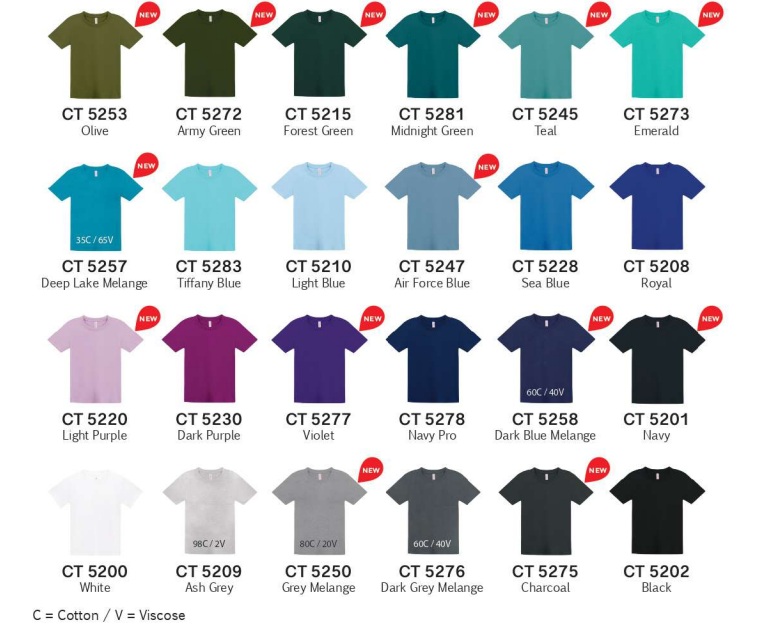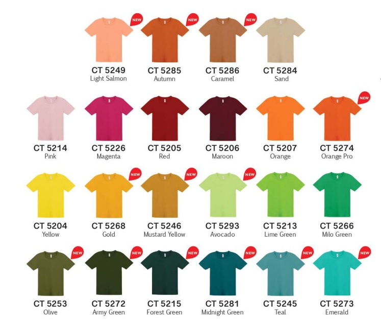 CT5200 White, CT5202 Black, CT5204 Yellow, CT5205 Red, CT5206 Maroon, CT5207 Orange, CT5208 Royal, CT5209 Ash, CT5213 Lime, CT5226 Magenta, CT5228 Sea Blue, CT5230 Dark Purple, CT5276 Dark Grey Melange, CT5278 Navy Pro, CT5478 Navy Pro, CT5283 Tiffany Blue, CT5284 Sand, CT5266 Milo Green, CT5214 Pink, CT5210 Light Blue