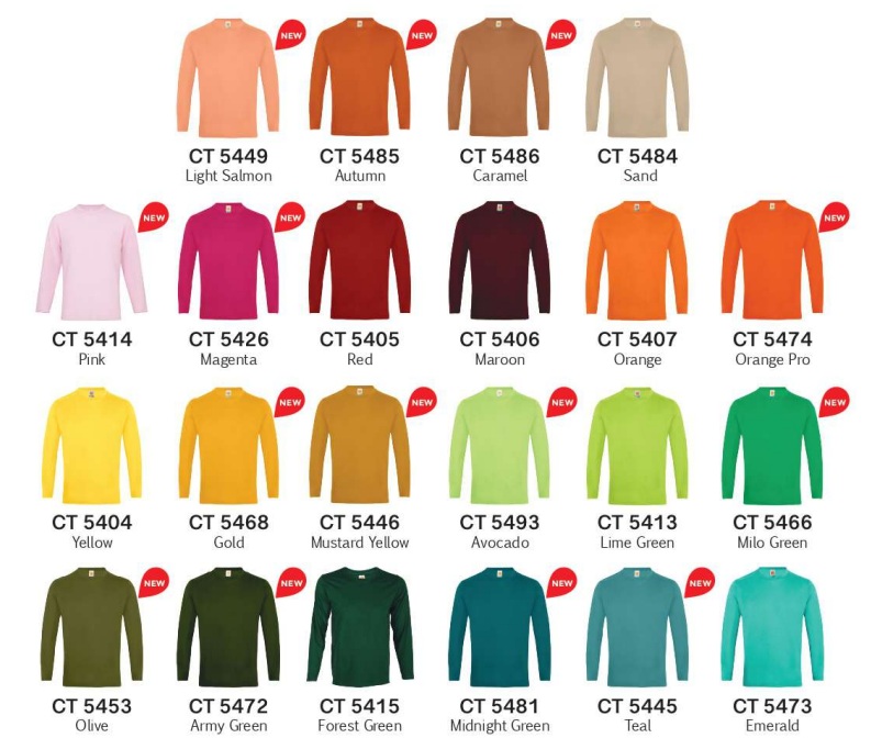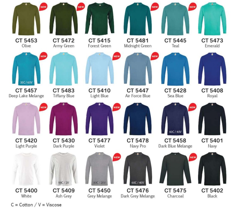 CT5400 White, CT5401 Navy, CT5402 Black, CT5404 Yellow, CT5405 Red, CT5406 Maroon, CT5407 Orange, CT5408 Royal, CT5409 Ash, CT5413 Lime, CT5415 Forest, CT5428 Sea Blue, CT5430 Dark Purple, CT5473 Emerald, CT5476 Dark Grey, CT5478 Navy Pro, CT5183 Tiffany Blue, CT5484 Sand